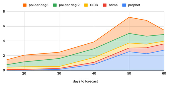 SEIR was clearly superior for this case of longer forecast periods, it had the best scores overall and least variance (error between 32% and 45%). The specific modeling that considers important epidemiology concepts overcame the results of generic models when modeling on longer spans. ARIMA was next (7% to 85% errors), then POLY der deg 2 (34% to 131%), while the polynomial of degree 3 was much worse (59% to 220%). Prophet (4% to 275%) had the smallest errors up to forecast length 30 and then the largest errors for the remaining lengths. The advantage of ARIMA over Prophet on longer spans could be related to ARIMA adjusting its p, d, q parameters.