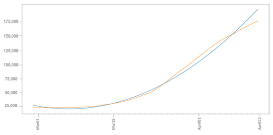 In our case the x is the time unit (the forecast is Ya value for time unit ti. Different polynomial degrees were tested in our experiments. We will show in our experiments that forecasting with POLY over differentiated curves of “number of active patients” instead of the original followed by an inverse transformation to reconstruct the curve yielded best results (ARIMA also uses differentiation to work on stationary curves).