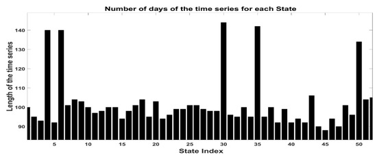 To evaluate the performance of the proposed method, several experiments are conducted in this section for three values of the parameter α in the distance metric . The time series of the states of the United States was taken from John Hopkins database. Data range from 22 January 2020 to 14 June 2020, covering all the states (including Puerto Rico and District of Columbia). For the computation of the distance metric, a threshold Imin was defined, defining the minimum number of infected people to start the time series, being for this study Imin = 5 (the number of confirmed was greater than 5). Therefore, the length of the time series is different for each state, being on average 101 days (Figure 1). The index of each of the states is presented in Table 1.