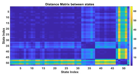Distance or similarity symmetric matrix to characterize the behavior of the time series for the states of the United States (parameter α = 0.5). The greater the similarity, the smaller the distance between the series (being the diagonal of this matrix of zero value).