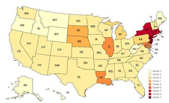 The similarities and distances between the different states and clusters obtained can be analyzed using the results presented in the hierarchical clustering (Figure 3) and distance matrix (Figure 2). Figure 4 presents a geographical representation of all the states according to the cluster grouping obtained in Table 1, using the similarity between the clusters obtained using the dendogram in Figure 3.