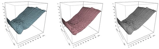 Empirical values of age-specific mortality rates of males (left), females (middle), and total (right)—Czech Republic; x—years, y—ages, z—rates; Source: Human mortality database, own elaboration.