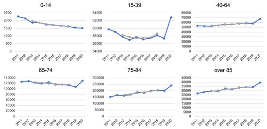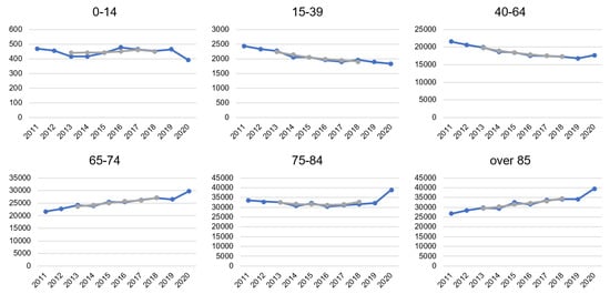 In the Czech Republic, there had been an increasing trend of mortality in age categories over 85 and 65–74 already, but in 2020, the increase is more pronounced. While in the age category 75–84 years, there was rather a stagnation in mortality during the observed period, 2020 meant a significant change in the direction to higher mortality. In 2020 a decreasing trend of death in the group 40–64 was broken. In age categories up to 39 years, the number of deaths decreased recently, and even 2020 was not an exception.