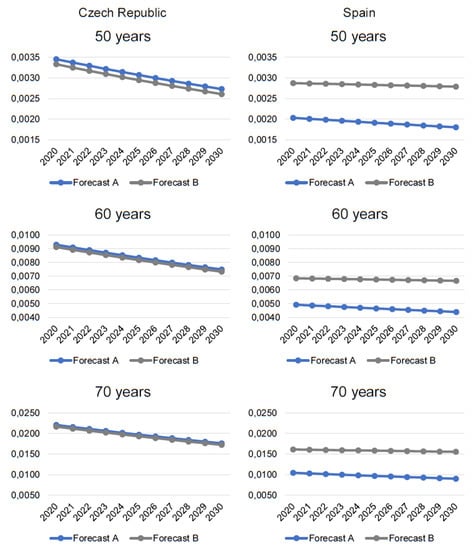 where Dx,t is the number of deaths in time t. Data about mortality rates for 2019 in the Czech Republic comes from the Czech Statistical Office (Prague, Czech Republic) database, and for Spain for 2019 are taken from Instituto Nacional de Estadística (Madrid, Spain). Data for 2020 are available in The Human Mortality Database, but they are not age-specific (there are only age categories 0–14, 15–64, 65–74, 75–84, 85+), so the projection cannot include this year directly.