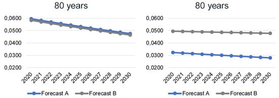 As an example of the results, we reported the forecasted mortality data for 50, 60, 70, and 80-years-old people because higher ages are more affected, and the differences in forecasts A and B increase after the age of 50. The results are displayed in Figure 5.
