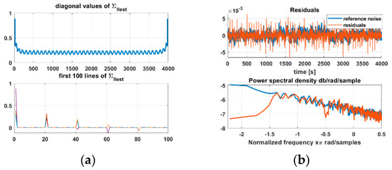 (a) Analysis of (diagonal values and first 100 lines). (b) (top) residuals (red line) and reference vector (blue line) and their corresponding psd (bottom), loglog plot.