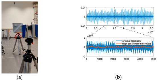 In many applications, as, for example, in surface approximation, is often replaced with the identity matrix, assuming equal variances for the observations. From (3) we have access to the variance and covariance of the noise observations from the residuals of the approximation, if we assume that the terms contained in are much smaller than those of . The knowledge of allows us to avoid an overestimation of the precision of the LS estimator and potentially biased statistical tests. It can be used to describe and quantify the sources of correlations: the cables, the atmosphere, or the processing at the receiver level. Such information provides precious data for stochastic modeling.