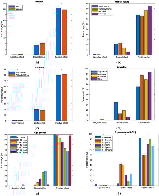 Positive, neutral, and negative opinions regarding the impact of Tai Ji in all five QoL domains investigated in terms of (a) gender, (b) marital status, (c) children status, (d) educational status, (e) age group, and (f) experience with Tai Ji.