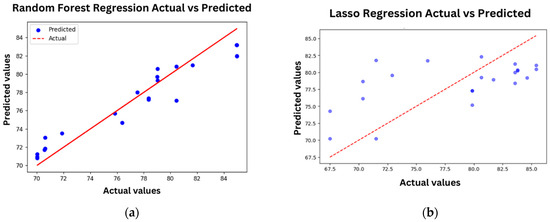 Different graphs of regressions comparing actual heart rates and the correpnding predicted values: (a) linear regression graph of Random Forest Regression and (b) linear regression graph of Lasso Regression.