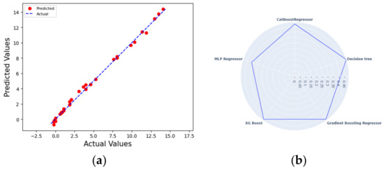 We analyzed the effect of fluid velocity , time t, rΔ and particle velocity on the concentration of the nanoparticles. Figure 2a tells us that as time increases for a particular value of fluid velocity , the concentration of the nanodrug increases at a specific location. Figure 2b is a graph of concentration of the nanoparticles versus time taken for rΔx of 0.3, 0.4, and 1. Figure 2c tells us that for a particular rΔx, as time increases, the concentration of the particle increases at a specific location. Figure 2d tells us that for a moving drug particle, concentration at a point increases as time increases. Figure 3a is a graph showing the difference between the true values and the values predicted by the MLP model. We can visualize from the graph that our dataset has a good fit for the multiple-layer perceptron model. Figure 3b displays the radar diagrams for root-mean-square error for the machine learning models (Gradient Boost, XG Boost, Regression Tree, MLP Regressor, and CatBoost Regressor) applied to the dataset. We can visualize from the radar diagram which model obtained ha the least RMSE.