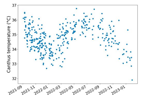 Figure 2 shows the long-term monitoring of one individual (September 2021–February 2023). Higher temperatures (maximum canthus temperature) were visible during summer months, while lower temperatures were observed during winter months. This is an expected result due the fact that individuals were measured immediately after they entered the building. However, the magnitude of the differences in the winter and summer months was surprising. This can pose a significant challenge for the detection of fever. It should be pointed out that the measurement was performed this way because one of the project’s objectives was to investigate the impact of outside temperature on the measurement. The person’s temperature measurement should be performed inside after about 20 min in standard room conditions. The results show a large variation of values due to significant changes in outside temperature. This can be an issue for detecting fever, but it may be beneficial for detecting some diseases; e.g., if parts of the face heats up/cools down at different rates.