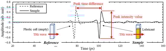 As shown in Figure 1, the intensity peak of the sample time waveform, appears later than the intensity peak of the reference time waveform due to the refractive index of lubricants. The peak time difference Δt was determined by Equation (2) and used as the characteristic value corresponding to the refractive index.