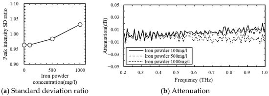 Figure 3 shows the transmission characteristics of iron powder-containing samples. As shown in Figure 3b, the attenuation increases with increasing iron powder concentration in the frequency range above about 0.5 THz. Since the particle size (50 μm) of the iron powder is sufficiently smaller than the wavelength (0.3–1.5 mm) of the THz-TDS system used in this study, Rayleigh scattering may occur, and the higher frequency components may be more scattered. In addition, as shown in Figure 3a, the standard deviation ratio increases as the iron powder concentration increases. It is thought that the intensity of the transmitted wave varies depending on the measurement position and timing because iron powders are not dispersed in a completely uniform state in lubricants.