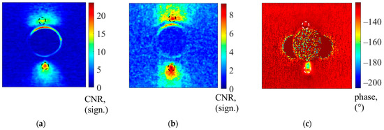 Comparison among the obtained results considering conduction thermography (100 A) and TSA as reference—titanium material: (a) slope results in terms of normalized maximum contrast with the cooled camera, (b) same algorithm and procedure with the acquisition of the microbolometer sensor and (c) phase map from TSA.