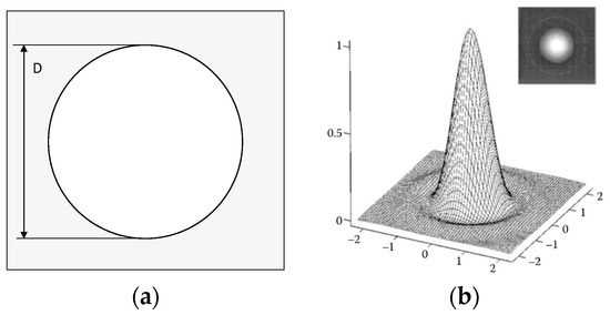 (a) Transmission profile of a circular pupil. Gray indicates zero-transmission and D is the diameter of the pupil. (b) Point spread function (psf) of an optical system with a circular aperture in the absence of aberrations.