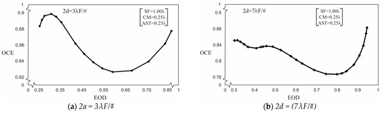 The OCE as a function of the EOD with the proportion of aberrations; spherical to coma to astigmatism = (1:0.25:0.25) for (a) 2d = (3λF/#) and (b) 2d = (7λF/#) detector pixel and the optical/infrared system, as presented in Figure 3.