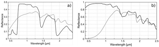 (a) Typical reflectance of healthy (solid line) and dry (dash line) vegetation; (b) reflectance of cellulose (solid line) and lignin (dash line). Data acquired from USGS Spectral Library Version 7: U.S. Geological Survey Data Series.