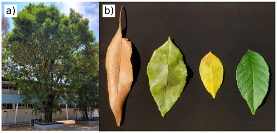 Leaves used: (a) the tree of the sampled leaves was located at the university campus; (b) the senescent leaves were collected under the tree and the healthy leaf was cut along with a small branch to maintain freshness.