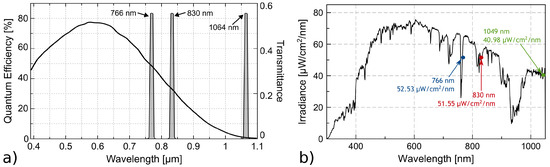 Figure 4b presents the measured spectral solar irradiance from 300 nm to 1049 nm. This is the radiometric reference value to probe the responsivity of the CMOS detector (Figure 4a) to explain the results of the images of the leaves. The entire irradiance of the narrow band is and .