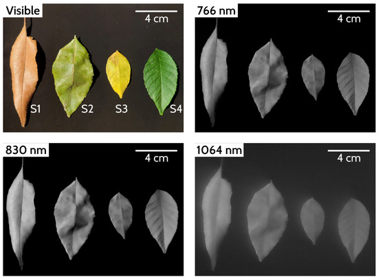 In Figure 5, we compare the images obtained with the three filters. In each frame, we show the four leaves in different states of decomposition (S1, S2, S3, S4). The color image is a reference used to identify visible features, but it is necessary to detail other characteristics to explain the results. Table 1 summarizes the sample characteristics and the information on the intensity levels of the images related to the reflectivity of the leaves.