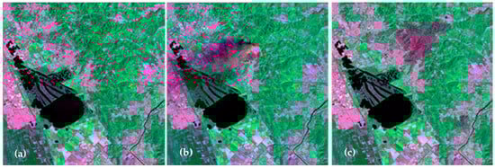 Landsat images: (a) image acquired before the fire (18 July 2022); (b) image acquired during the development of the fire (19 July 2022); (c) image acquired a few days after the end of the event (27 July 2022). RGB composition = (SWIR2200, NIR, SWIR1610).