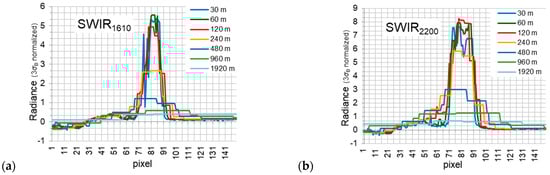 SWIR band radiance along a transect crossing the fire for different spatial resolutions: (a) SWIR band at 1610 nm and (b) SWIR band at 2200 nm. Radiance was normalized at 3σB.