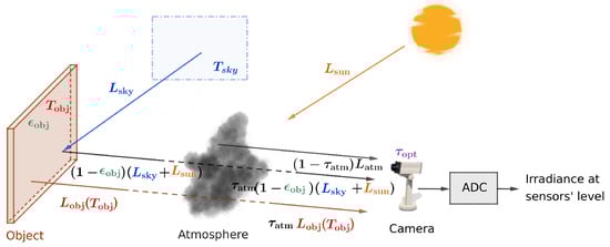 As mentioned earlier, in order to estimate the temperature from the irradiance measured by an infrared camera, it is necessary to consider the global radiative heat balance at the sensor level, represented in Figure 1. Such balance relies on the estimation of different environmental parameters such as, for instance, the environment temperature, the sun, atmosphere contribution and involved transmissions. Of course, the emissivity of the object also needs to be known or estimated, for which particular temperature and emissivity separation methods can be used []. For comprehension and writing simplification, we derive a simplified heat balance with such quantities for a given pixel and given wavelength as