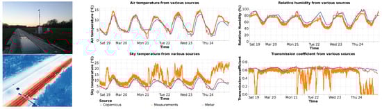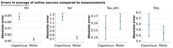 For online data, the air temperature is usually straightforward to obtain since it is directly provided in the data sources. However, the sky temperature can be approximated from the air temperature by using literature correlations or models []. In this study, the sky temperature is deducted from the correlation proposed by P. Berdahl and R. Fromberg []. Previous results showed that the sky irradiance and sun contribution could also be simulated by using simulation models []. For on-site data, the sky temperature is obtained from a pyrgeometer while the air temperature is measured with a probe on the weather station. The relative humidity is given by METAR data and measured on-site with the weather station. For Copernicus though, it needs to be derived from the air temperature, the surface pressure and the dew point by using the August–Roche–Magnus formula []. The atmosphere transmission coefficient is also computed from a correlation, by using the sky temperature and the relative humidity.