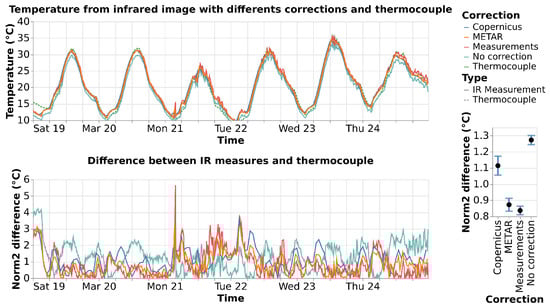 Finally, a comparison of the estimated temperature with the infrared camera and a thermocouple at ground has been performed and results are shown in Figure 4. Even if the thermocouple measurement cannot be considered as a ground truth, it is still a fair temperature reference. In this figure, it can be seen that on this period of interest, any consideration of environmental parameters from any provider will make the estimation closer to the thermocouple measure. In particular, on-site measurements provide, on average, the closest temperature estimation to the thermocouple. Please note that more investigations need to be made for particular weather conditions such as snow and rain for instance, which were not observed during this period.
