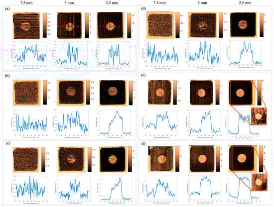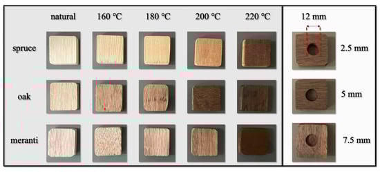 As shown in Figure 1, the specimens investigated in this study comprised spruce, oak, and meranti wood. All samples possessed dimensions of 40 × 40 × 10 mm. The three groups of wood specimens can be divided into untreated wood and thermally modified wood at temperatures of 160 °C, 180 °C, 200 °C, and 220 °C. Prior to the pyrolysis process, each sample was intentionally provided with manually created flat-hole defects. The depths from these flat-bottom holes to the sample surface were set at 2.5 mm, 5 mm, and 7.5 mm, respectively, while their diameter remained consistent at 12 mm.