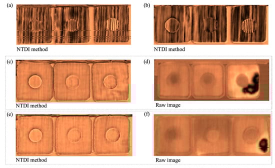Figure 3 shows the delamination detection results for the three types of wood. It is obvious that the meranti has the best resistance to pyrolysis. This is due to the fact that there is no dark area in the NTDI images for the meranti specimens. In particular, for the raw image in Figure 3d,f, there are obvious areas of color differences. They can be considered defective areas through experience. However, this was proven wrong by observing the NTDI images. In fact, the abnormal area is caused by the water content instead of delamination, which is discussed in the previous section.