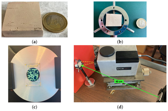 (a) Clay brick sample; (b) sample mounted in holder; (c) random pattern mounted in front of the exit of the laser; (d) experimental layout: the yellow dashed line indicates the field of view of the IR camera, the green arrow indicates the incident laser beam.