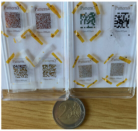 An experiment was performed on a piece of clay brick with thermal diffusivity [m s] ± , as obtained by measurement of thermal conductivity by a Hot Disk ( [W m K] ±), specific heat by a DSC ( [J kg K] ± ), and density by weight and volume ratio ( [kg m] ± ). The laser is shot at the sample in a random pattern, similar to a QR-code. The single pulse duration is 2 ms with an energy of 1 Joule. The repetition rate is 30 Hz. The laser beam passing through the pattern has a diameter of 0.5. The IR camera collects a sequence of images, 80 × 320 pixels, at a frame rate of 150 Hz. The Field of View corresponding to a pixel is 108 μm. Those pieces of the experimental set-up are shown in Figure 2. Eight different random pattern were produced in the facilities of the Tokyo Institute of Technology and Tsukuba AIST by sputter deposition of gold on glass substrate, 14 × 20 × 0.7 mm. The area covered by the pattern is 10 × 10 mm. The eight patterns with different spatial resolutions are depicted in Figure 3.