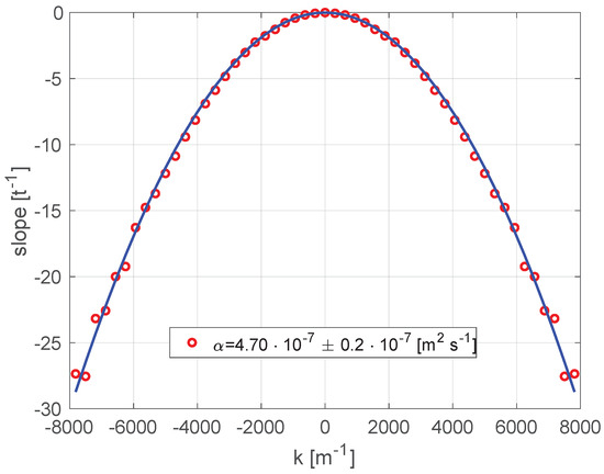 Each point in the plot is the slope of the straight line that fits the amplitude of the spatial Fourier Transform of the IR image at a certain spatial frequency. The slopes depend quadratically on the spatial frequency k and the coefficient of the quadratic term in the parabola is the thermal diffusivity.