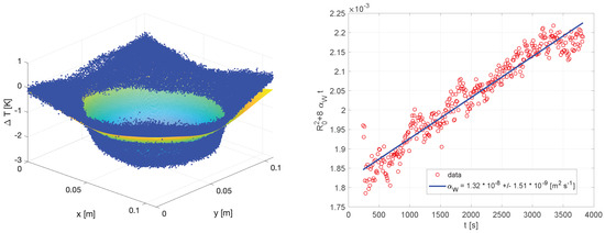where is the amplitude of the Gaussian function depending on time t, x and y are spatial coordinates, is the radius of the imprint (radius of the sponge) at time , and is the diffusivity of water to be estimated. Figure 2 shows, on the left, the fitting of Equation (2) with the data, and on the right, the fitting of the square of the radius as a function of time, with the slope representing .