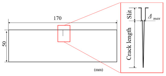Specimens with a one-sided through-crack are used in the experiments, as shown in Figure 1. The specimen material was carbon steel, JIS SS400. A 5 mm slit was introduced into a plate by electrical discharge machining, and a crack was initiated and propagated to approximately 22 mm in length from the tip of the slit by a four-point bending fatigue test. Then, the plate was sliced to produce specimens with thicknesses of 0.5 mm and 6 mm.