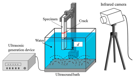 The sonic-IR system used in this study is shown in Figure 2. An ultrasound bath, model VS-600IIIS (VELVO-CLEAR), was used to generate the acoustic energy. The maximum ultrasonic excitation power was 600 W, and the ultrasonic frequency was set to 45 kHz. The dimensions of the bath were 325 mm in length, 275 mm in width, and 250 mm in height. Water was employed as the liquid of the ultrasound bath. A part of the specimen was immersed in water, and ultrasonic waves were input to the specimen via water.