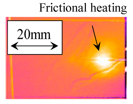 Heat generation around the crack during ultrasonic excitation was measured. For temperature measurement, the high performance infrared camera (FLIR systems JAPAN, Tokyo, Japan) with InSb infrared sensors (temperature resolution: 25 mK, spectral range: 3.0–5.0 μm, spatial resolution: 320 × 256 pixels) was employed. Infrared measurement frequency was set to 113 Hz. Flat black paint for emissivity improvement was applied on the surface of the specimen.