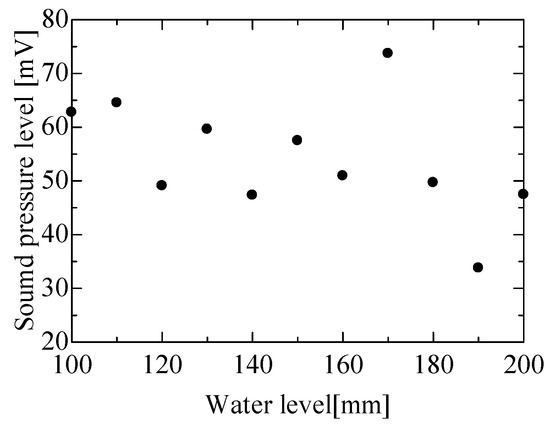 The relationship between water depth and ultrasonic sound pressure was measured at several different water levels. Figure 4 shows the relationship between water depth and sound pressure at water levels of 170 mm and 200 mm. Due to the standing waves in the water, several peaks were observed in the relationship between water depth and sound pressure. Figure 5 shows the average sound pressure from the surface to a depth of 50 mm at each water level. The average sound pressure level changed depending on the water level.