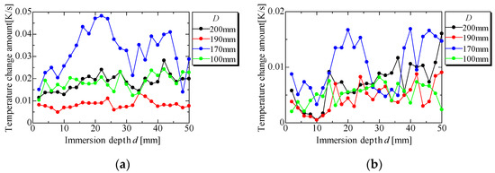 Relationship between immersion depth of specimen and temperature change around crack: (a) 0.5 mm thickness; (b) 6 mm thickness.