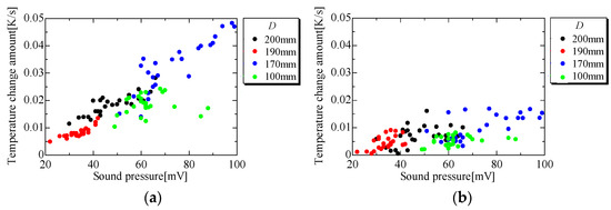 Relationship between temperature change around crack and sound pressure of water at the bottom of the specimen: (a) 0.5 mm thickness; (b) 6 mm thickness.