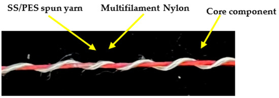 Figure 1 represents the three-component HAY strain sensor. The HAY strain sensor comprises Polyester-covered spandex core yarn (0.6 mm diameter, 120 tex) wrapped by the composition of high-modulus Nylon 66 multifilament (0.16 mm diameter, 100D/24f) and conductive low-modulus stainless steel/polyester (SS/PES) yarns.