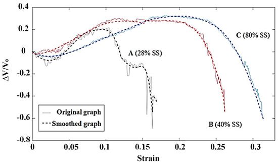 Voltage variation of HAY strain sensors under tensile loading: (A) sensor contained 28% SS in the conductive wrap component, (B) sensor contained 40% SS in the conductive wrap component, (C) sensor contained 28% SS in the conductive wrap component.