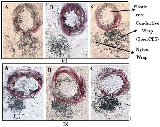 Cross-section of HAY strain sensors at two different strains: (a) zero strain, (b) and 0.2 strain; (A) sensor contained 28% SS in conductive wrap component, (B) sensor contained 40% SS in conductive wrap component, (C) sensor contained 28% SS in conductive wrap component.