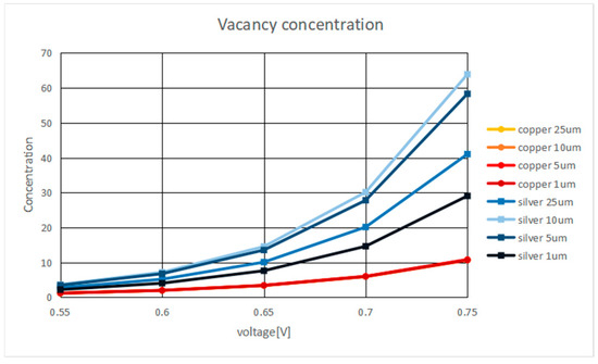 Vacancy concentration depending on the applied voltage for copper- and silver-coated yarn with a metal thickness of 1 µm to 25 µm.