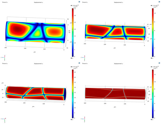 In the third step, the displacements based on the vacancy concentration were calculated. In Figure 4, the exemplary displacement distribution for the different metal coating thicknesses of 1 µm up to 25 µm for the 0.55 V copper metal is shown. It is obvious that, with the decreases in the thickness of the metal coating, the differences between the regions also decreased. In the boundary area of each grain size region, the displacement was always the smallest, and in the center area, the displacement was the largest. For the thickness under 5 μm, the maximum displacement of every region was the same. The direction of displacement was towards the outer side of the yarn surface. This means that the diffusion effect forced the metal coating to expand outward, while the amount of material on the inside surface decreased due to migration to the outside.
