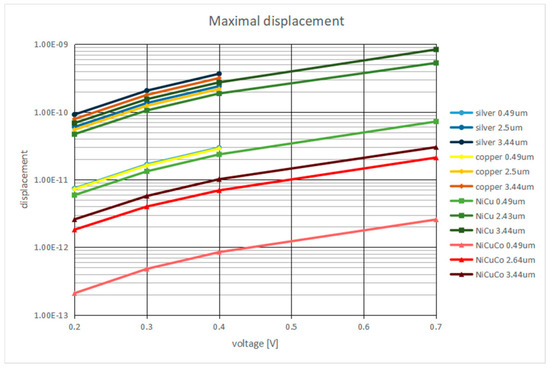In the next case, the Cu/polyester; Ag/nylon like Shieldex®; and NiCu/polyester and NiCuCo/polyester yarns with thicknesses of 0.49 µm, 2.5 µm and 3.44 µm were investigated. The displacement increased with increasing voltage and coating thickness (Figure 5). The maximum displacement for the NiCuCo coating was found to be the lowest.