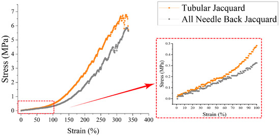 Both knitted fabrics break at around 350% strain. They display a linear plot for strains below 50%, indicating a spring-like structure capable of bouncing back after stretching. However, the tubular jacquard fabric requires a higher stress to achieve the same strain than the all needle back jacquard fabric. This indicates that the tubular knit is more tightly constructed.