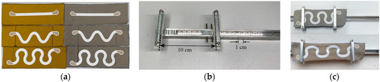 As shown in Figure 2a, three shapes of conductive tracks are investigated in this research: a straight line, a sine wave, and a horseshoe shape. The tracks were provided by Conductive Transfers Ltd. The tracks are laminated to both fabrics at 165 °C for 12 s under 6 bar pressure. After peeling off the support sheet, the insulated conductive materials have adhered to the fabrics.