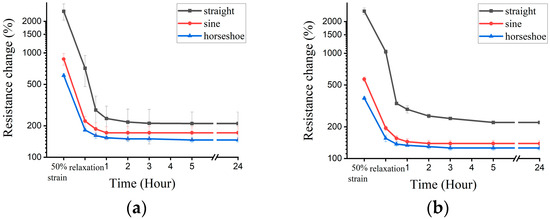 (a) Tubular jacquard fabric resistance change with 50% strain and during recovery. (b) All needle back jacquard fabric resistance change with 50% strain and during recovery.